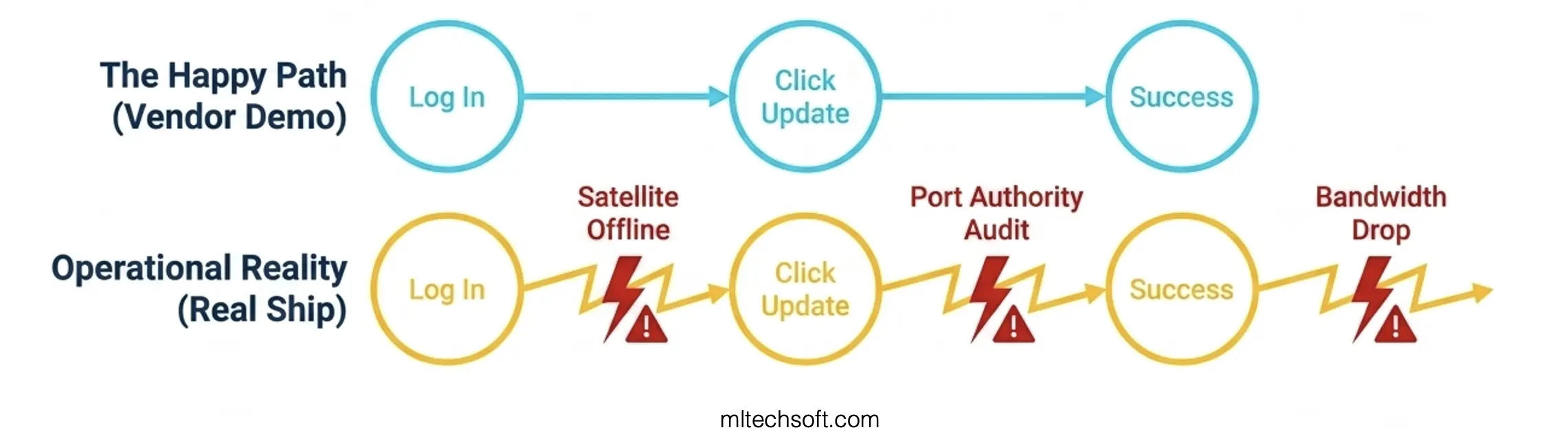 For example, “We’ve built systems for the maritime industry” sounds credible until you ask: “Walk me through how you handle crew certificate expiry during drydocking when your system is offline because the vessel lacks satellite connectivity in that port.” That specific scenario separates vendors who have delivered in real maritime operations from those who haven’t.