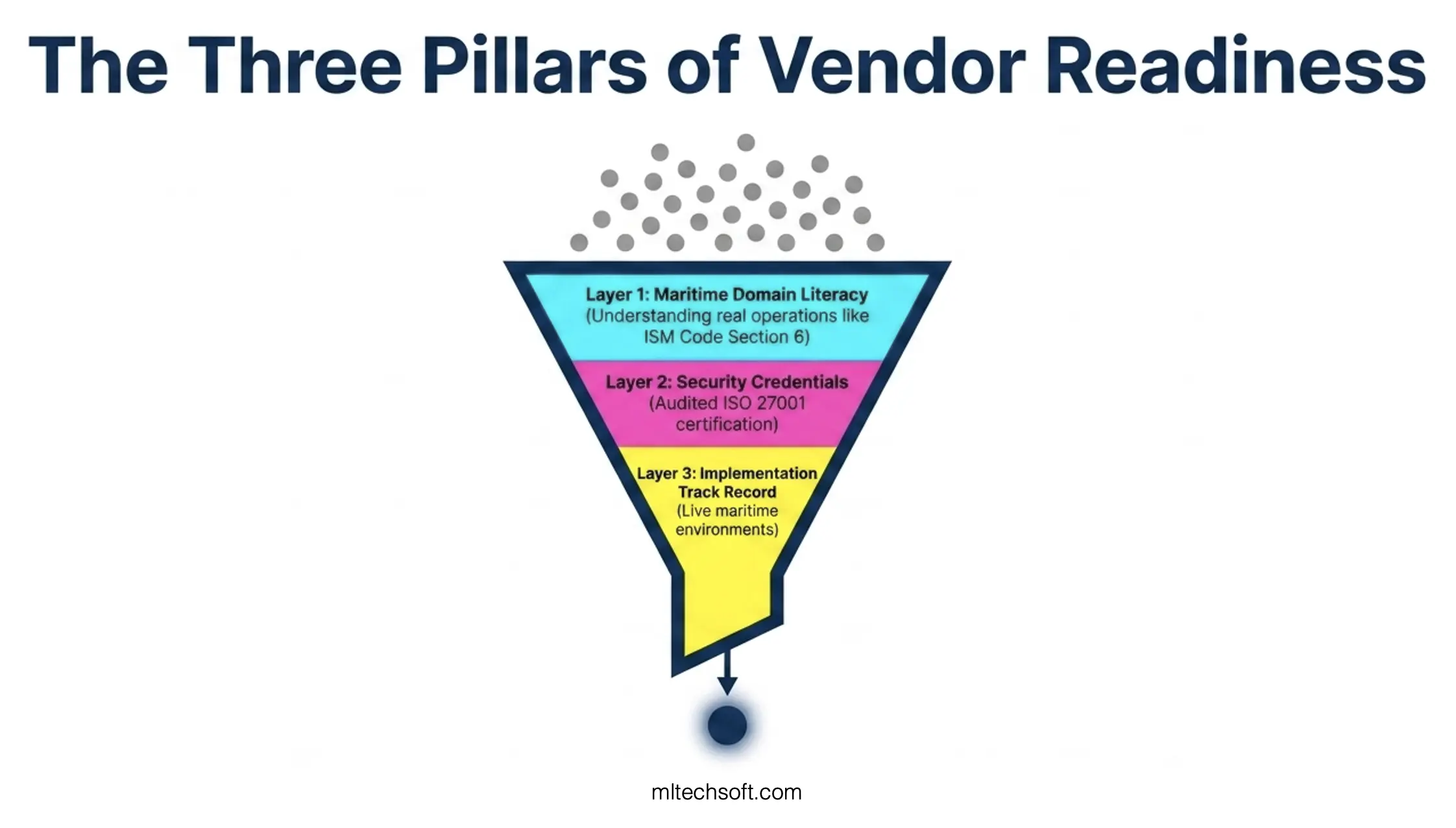 Key context: Maritime cyberattacks surged 103% in 2025 — the highest annual increase on record. The IMO published updated cyber guidelines (MSC-FAL.1/Circ.3/Rev.3) in April 2025, now aligned with NIST CSF v2.0. Ship managers are explicitly responsible for third-party supplier cyber risk. ISO 27001 is a minimum requirement for maritime software partners.