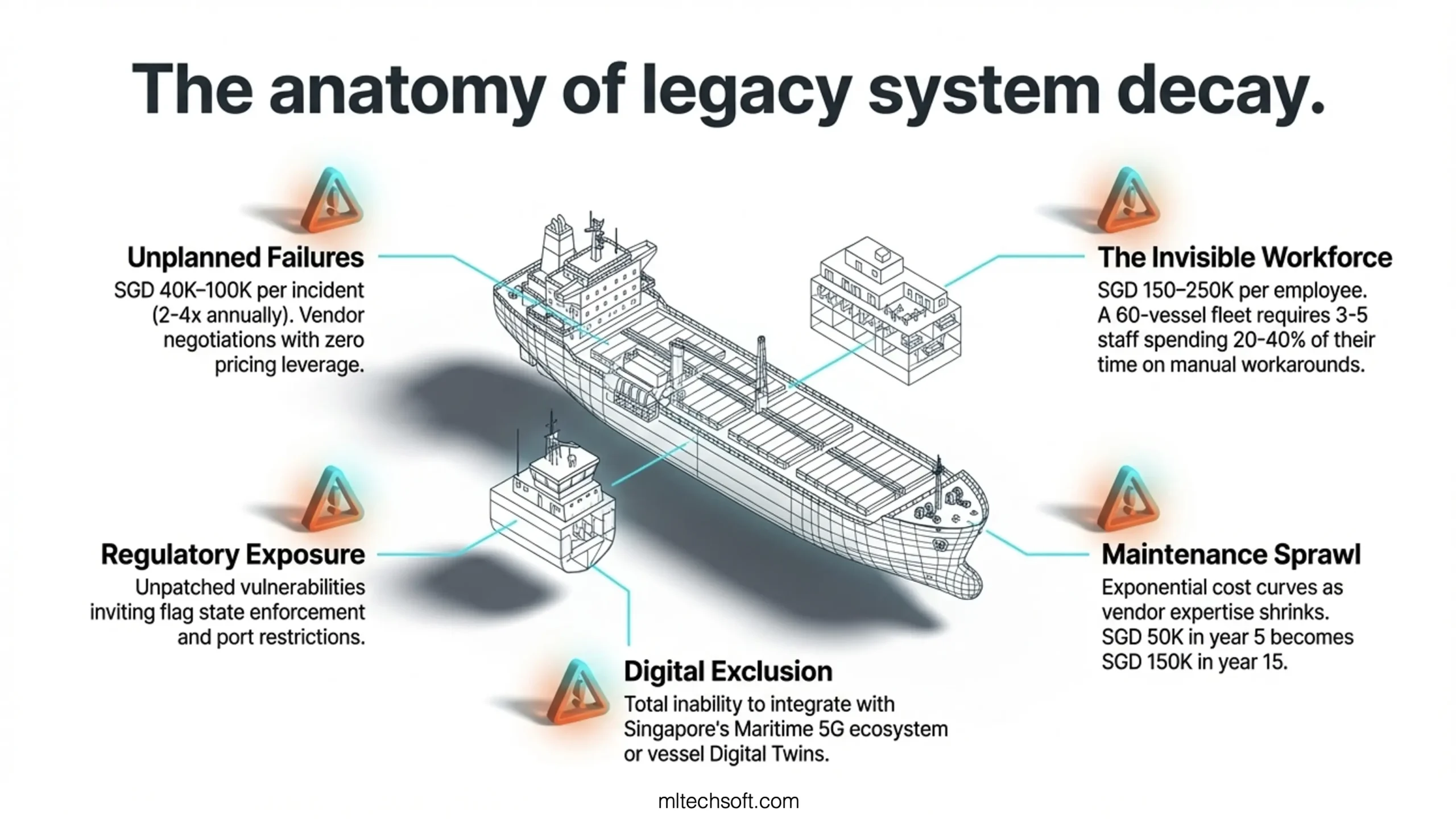 In our work with Singapore-based ship management clients, emergency fixes to systems older than ten years typically cost SGD 40K–100K per incident. Most organisations experience two to four unplanned failures annually. The vendor knows the system is aging and knows you’re desperate — pricing reflects that reality.