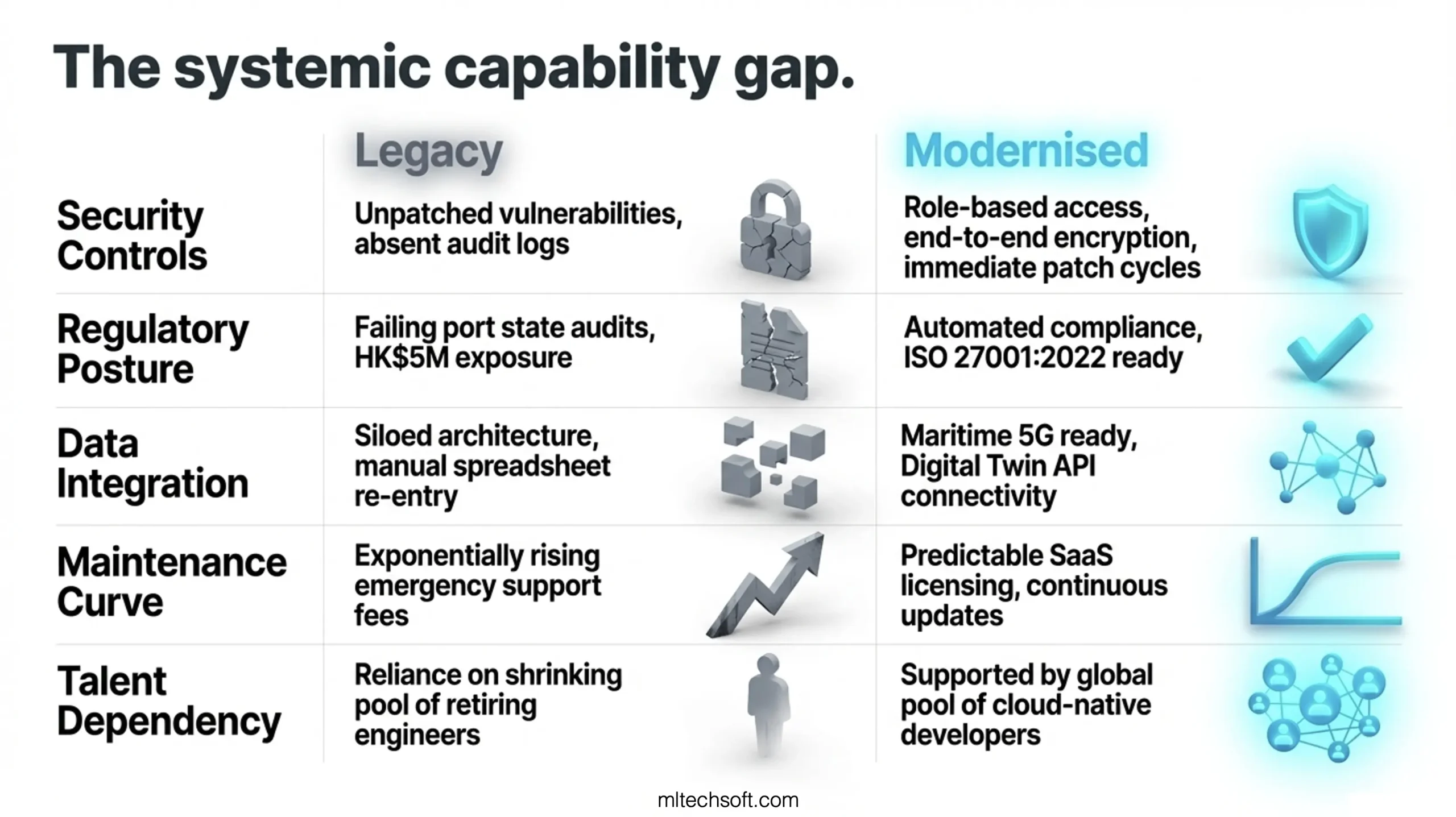 Legacy systems cannot participate in this ecosystem. They cannot share data with Maritime 5G sensors. They cannot integrate with Digital Twin platforms. They cannot consume real-time port state data or voyage optimisation algorithms. While competitors modernise their vessel management systems, legacy operators remain locked in 2010-era workflows, unable to access the tools that drive operational efficiency in 2026.